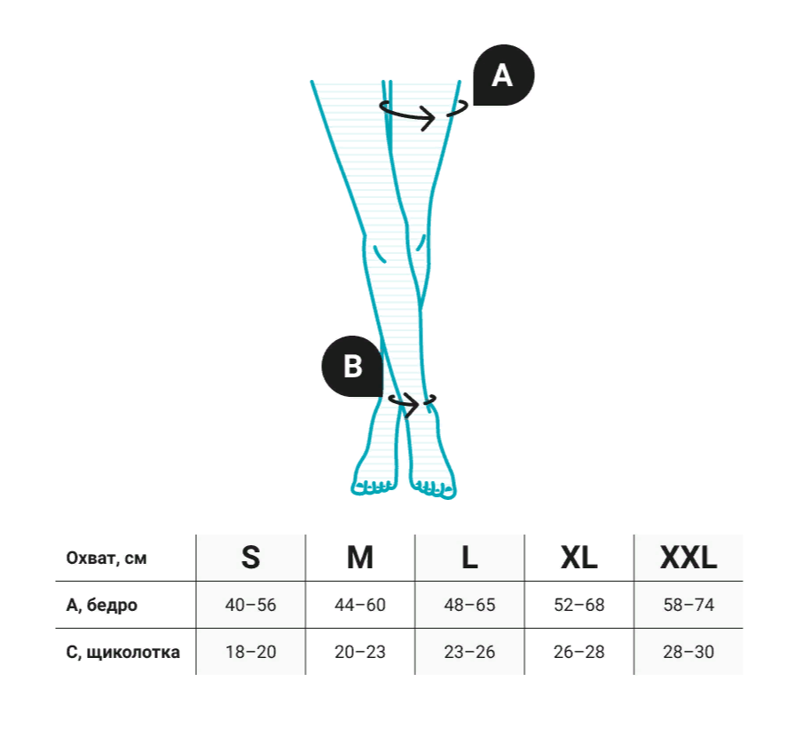 Обратите внимание! При подборе размера гольфов, чулок и колгот руководствуйтесь приведенными здесь таблицами. Измерения нужно проводить утром, до появления отеков на ногах.