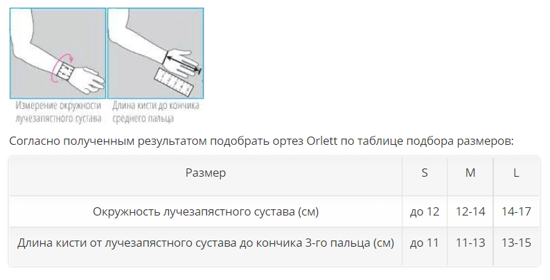 Для корректного подбора ортеза Orlett на пястно-фаланговый сустав необходимо измерить сантиметровой лентой (плотно, но не утягивая) окружность лучезапястного сустава и длину кисти от лучезапястного сустава до кончика 3-го пальца.